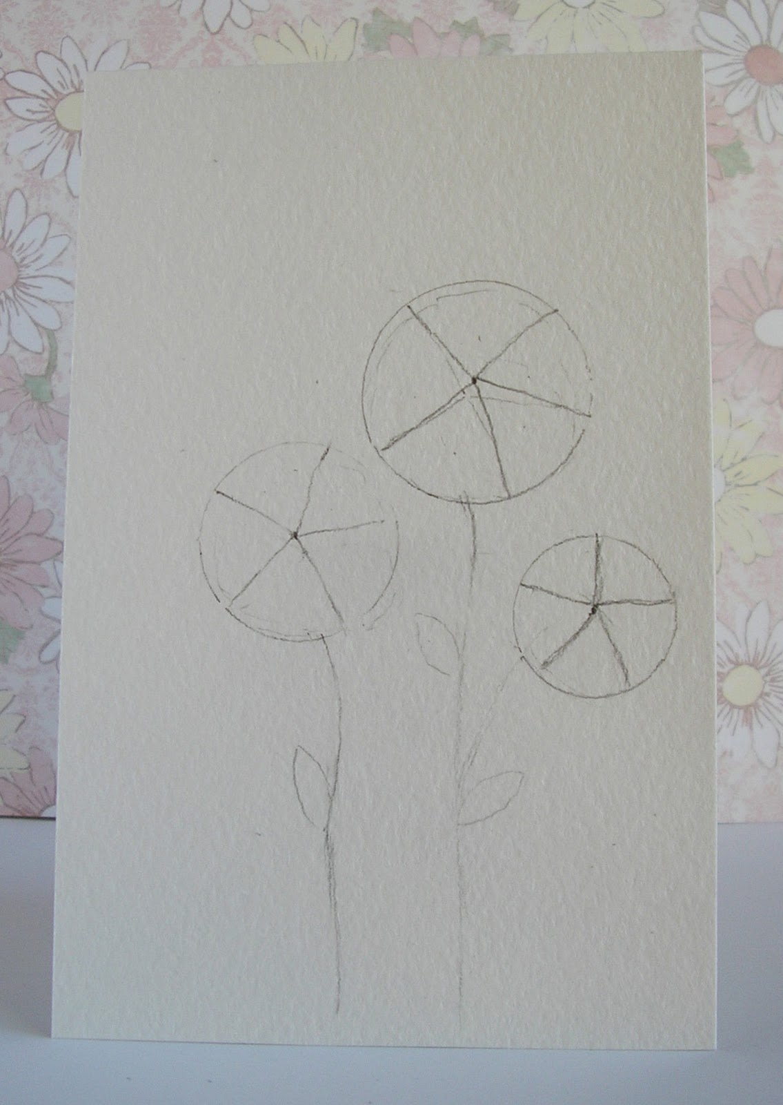 Из акварельной бумаги вырезаем прямоугольник размером 10х15 см (оптимальный размер для открытки).Рисуем на акварельной бумаге вот такой рисунок (у меня это 3 цветочка). Цветы рисуем в виде кружков разного диаметра. Каждый круг делим на 5 равных частей и рисуем лучики от центра круга.