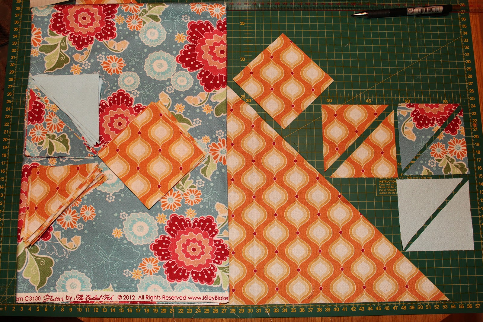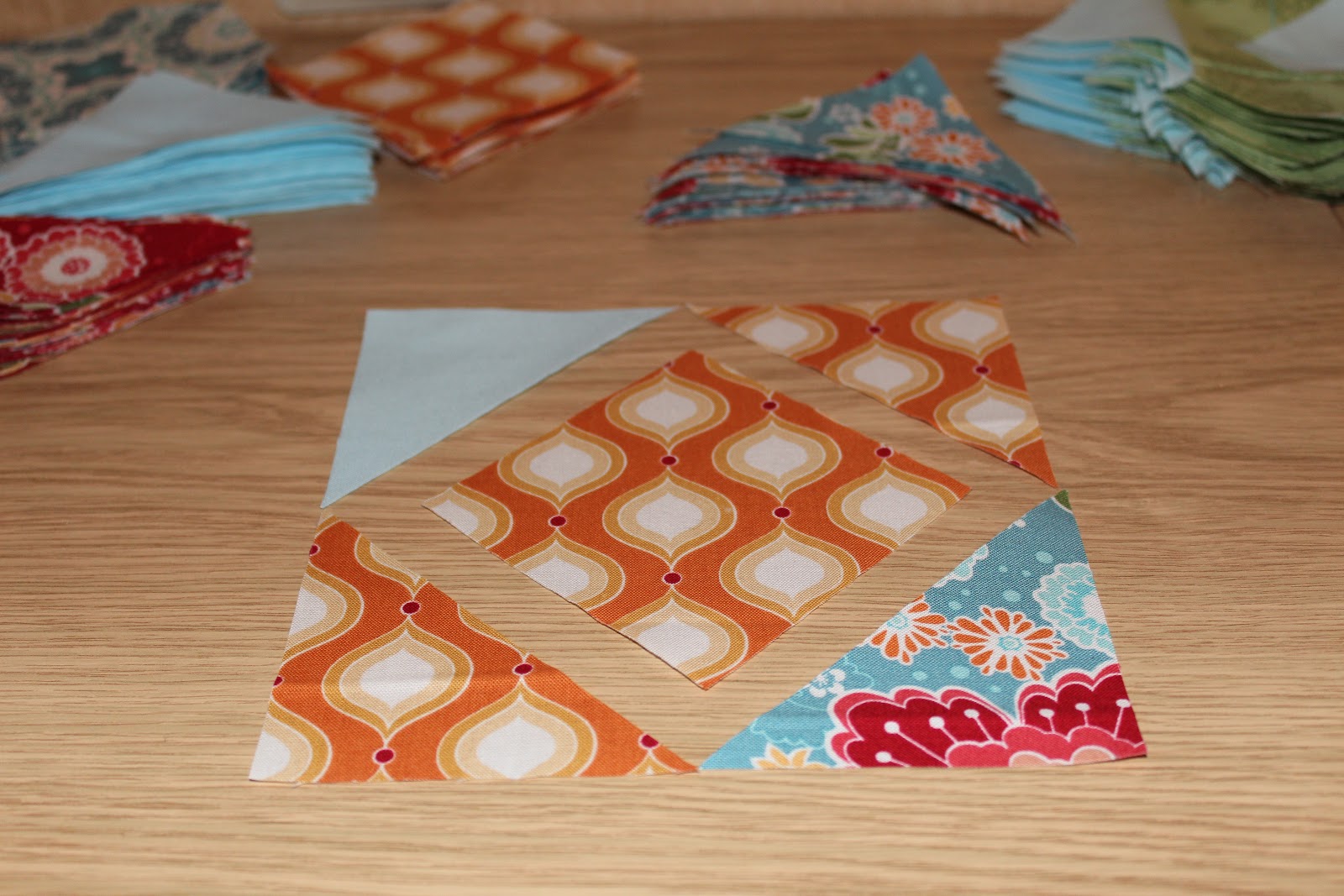* 1 боковой треугольник (голубой) - кроим 1 квадрат по долевой и поперечной, разрезаем его по косой на 2 треугольника, 1 треугольник оставляем себе, 1 откладываем в запасы