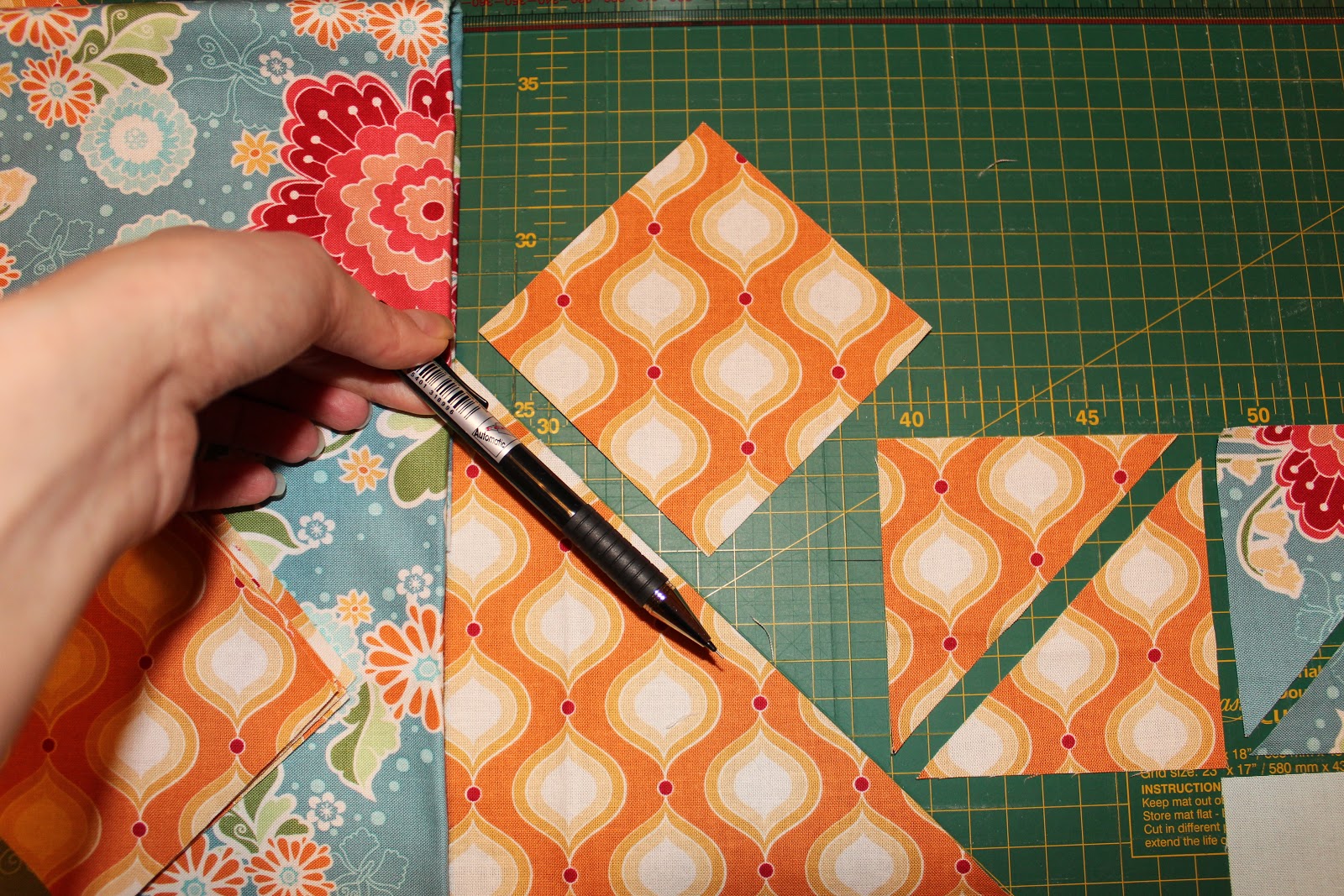 Когда кроим по косой, ориентируемся на метку 45 градусов на коврике. Для раскроя большого количества деталей по косой, сначала нарезаем косые полосы, а затем из них квадраты.