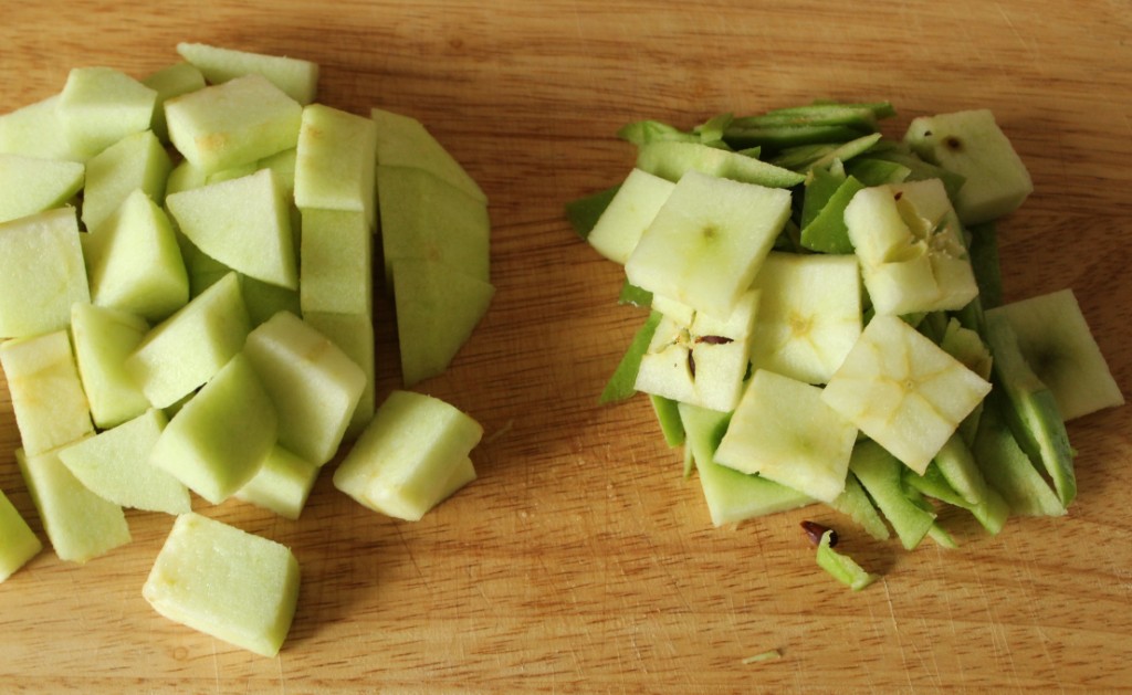 Яблоки нарезать кубиками, сердцевину и кожуру мелко порубить.