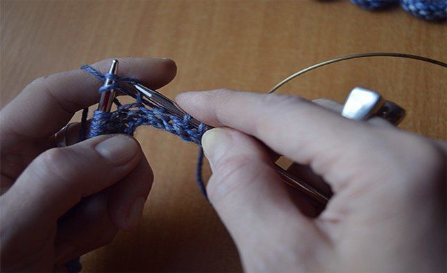 Провязать все петли лицевыми с двумя обвивами, для этого при провязывании каждой петли обвивайте спицу рабочей нитью 2 раза.
