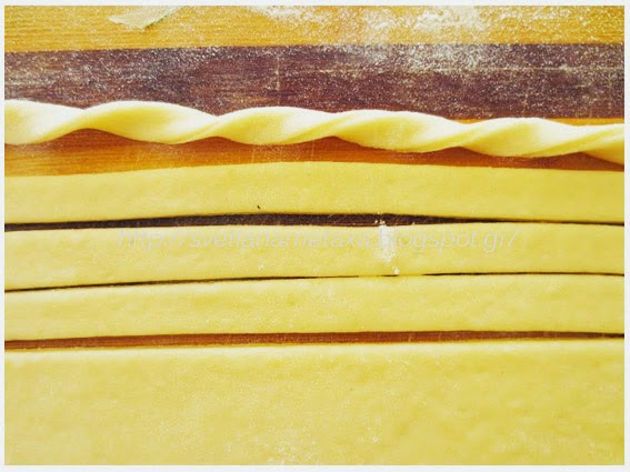 5.Из второй части теста раскатать овальный или прямоугольный пласт, толщиной 2-3 мм и ножом для пиццы разрезать на полоски, шириной 1 см. Каждую полоску закрутить в спиральку.
