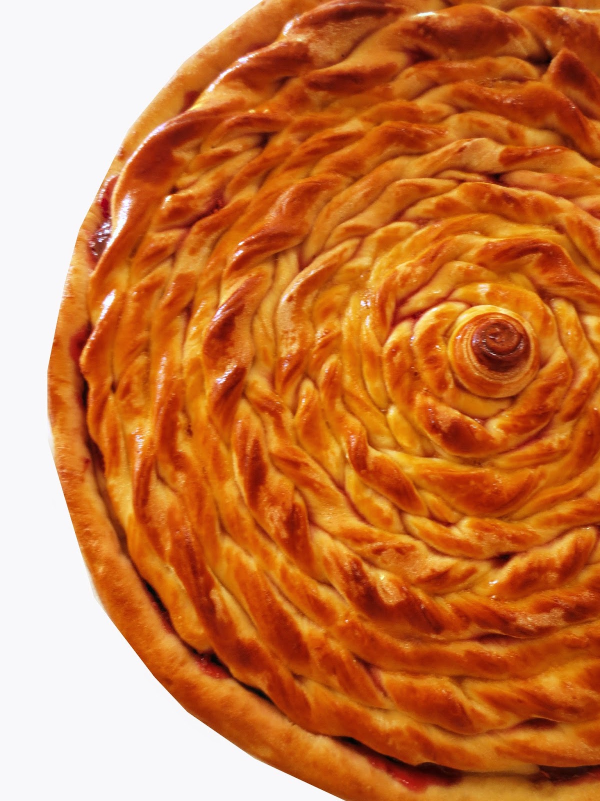 6. Выкладываем спиральки на начинку, начиная от центра по кругу, заполняя ими всю поверхность пирога.