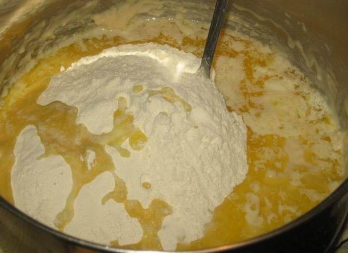 3. Как только дрожжи начнут пузыриться, добавляем яйца и немного муки. Муку лучше добавлять постепенно.
