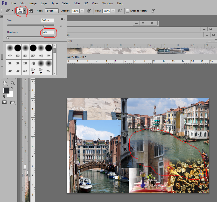 Берем инструмент Eraser (Ластик). В настройках на панели свойств выбираем нужный размер. Hardness (Жесткость) обязательно ставим 0.