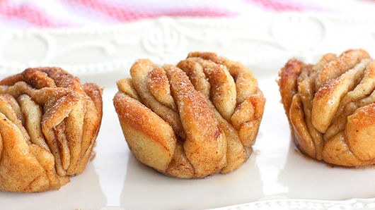 Положите все дольки на большой лист вощеной или пергаментной бумаги и разгладьте скалкой. Смажьте каждый диск теста растопленным маслом. Окуните намазанные маслом ломтики в сахарную смесь с корицей. Добавьте оставшуюся смесь масла и сахара в подготовленную форму для кексов.