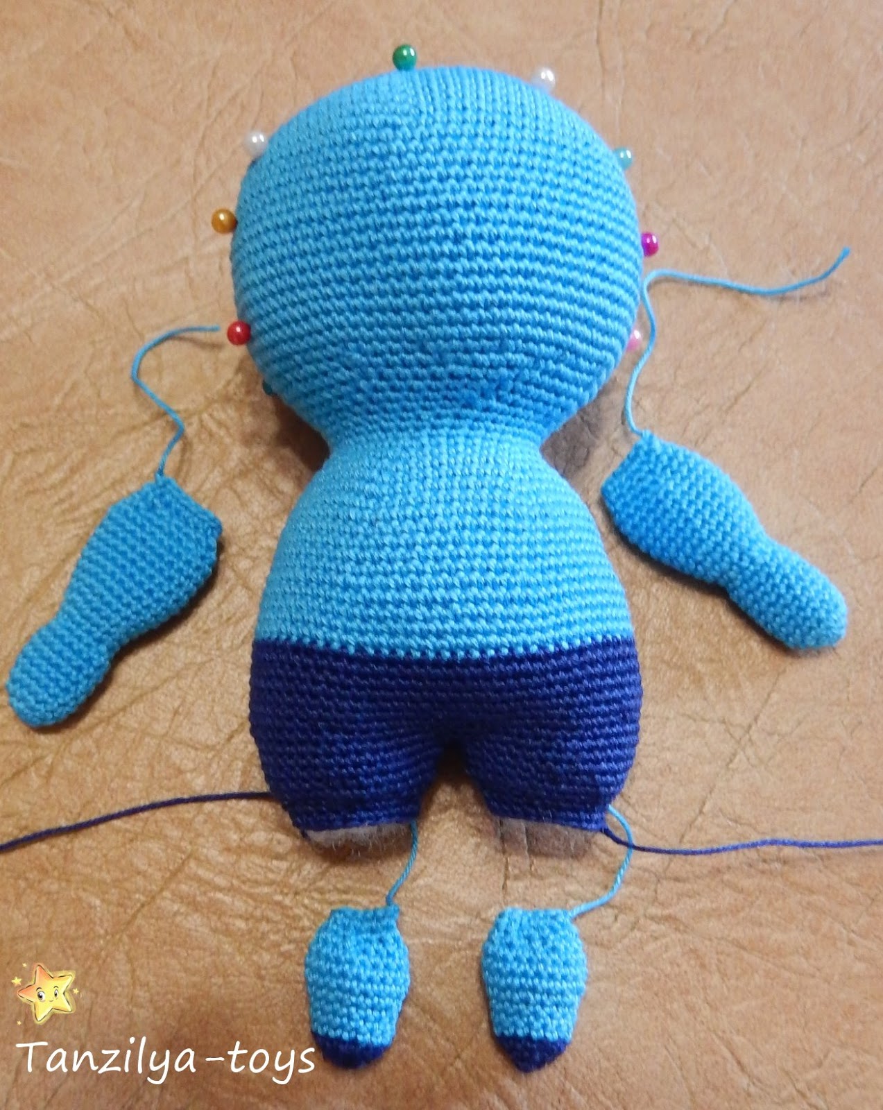 Приколоть ботиночки булавками (немного косолапом положении), а потом пришить ботиночки темно-синей нитью.