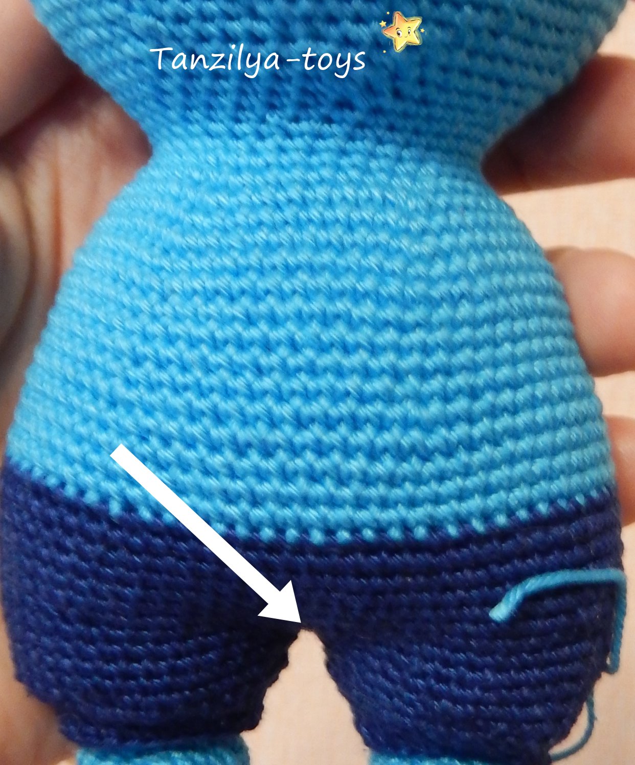 Ряд 63. 18 сбн, 4 вп (к противоположной стороне тела, проверьте, это должна быть середина туловища, на рисунке показано стрелкой), 18 сбн = 36сбн.