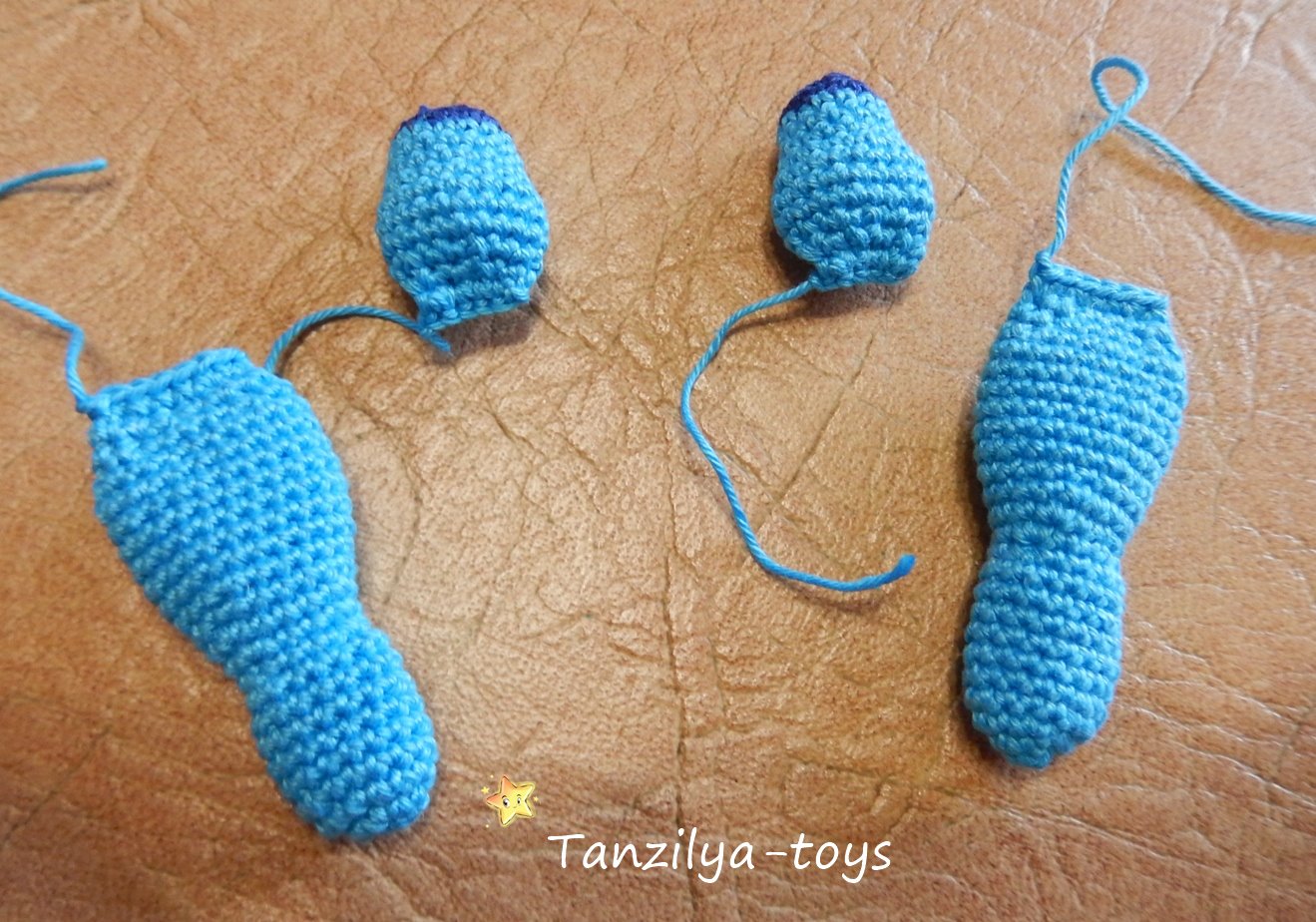 Дальше начинаем вывязывать ножки. Сначала одну, потом другую. Следите за тем, чтобы вязание всегда было с лицевой стороны.