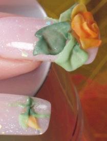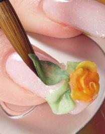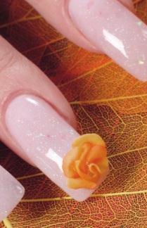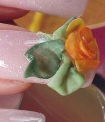 Для изготовления цветка используйте пудры персикового и оранжевого цветов. Персиковый акрил соединить с оранжевым, не смешивая их; и сделать очень тонкую, полупрозрачную пластинку. Затем ее неплотно складывают вчетверо – получается сердцевина розы.