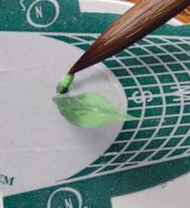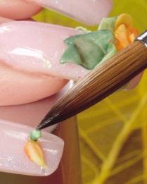 5. От центрального элемента композиции в сторону указательного и безымянного пальцев протягивают стебельки. На их продолжении на ногтях безымянного и указательного пальцев формируют бутон и два маленьких листочка .