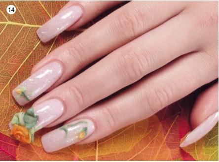 В данном случае невеста выбрала теплые розово-персиковые тона.Композицию выполняют на ногтях указательного, среднего и безымянного пальцев.