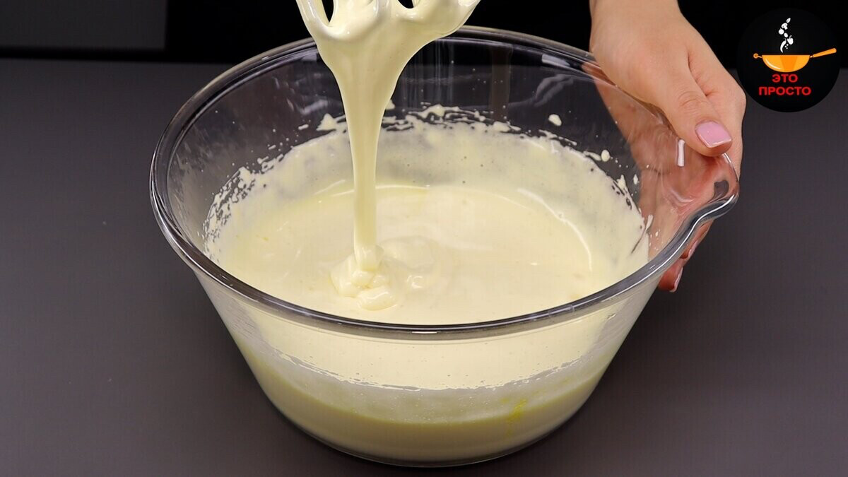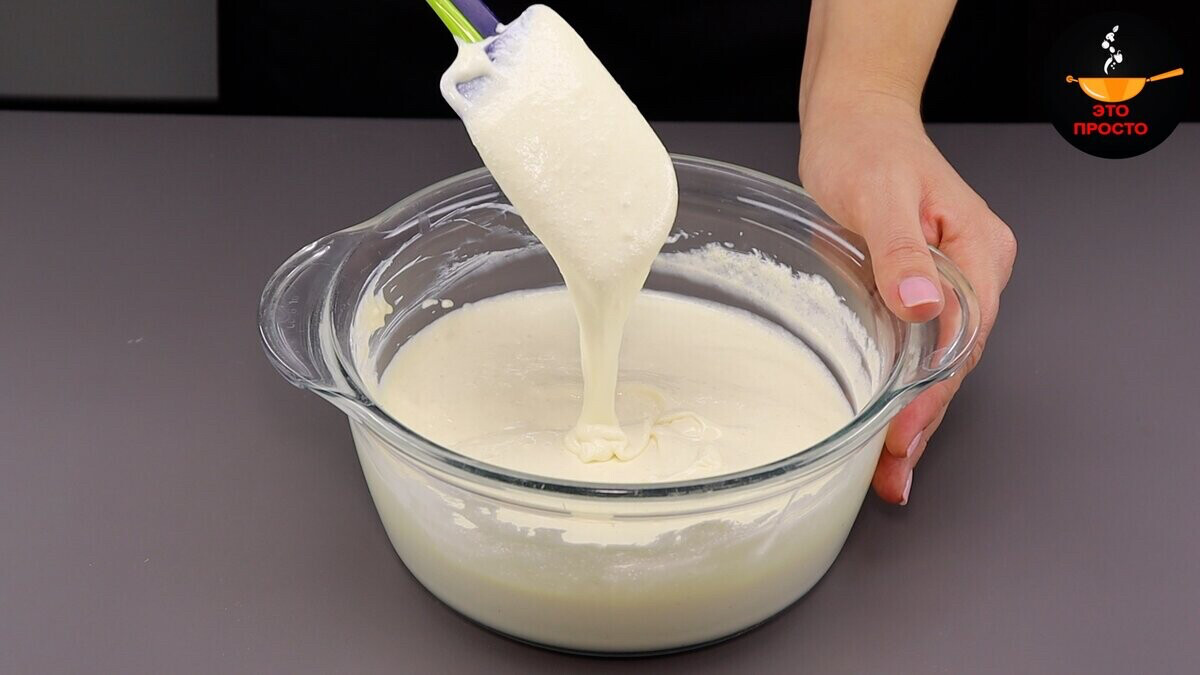 В два приема всыпьте 200 г просеянной муки и 1 ч. л. разрыхлителя. Перемешайте венчиком до получения густого теста.