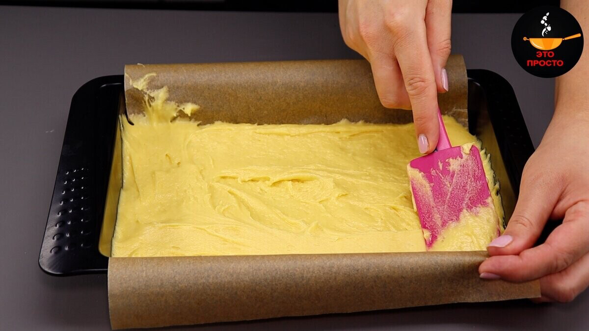 Застелите дно формы (26х19 см) пергаментом, оставив края свободными. Распределите тесто по форме.