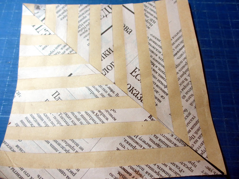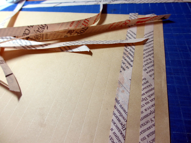 Нарезать газету на одинаковые полоски и наклеить на крафт конверта: