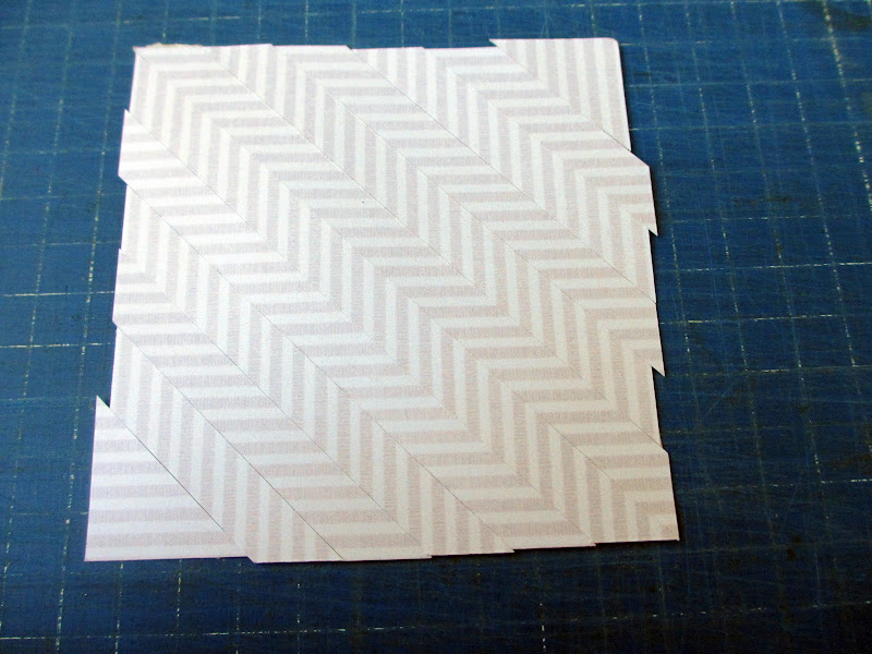 5.От полученного после склеивания квадрата снова отрезаем два треугольника. Линии отреза должны быть параллельны диагонали с одинаковым отступом (скажем, 1 см.) от диагонали в обе стороны таким вот образом: