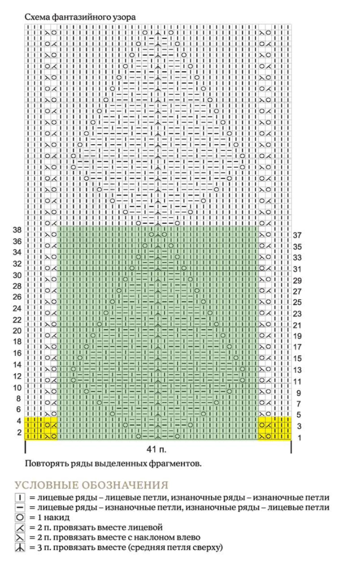 На спицы № 3,5 набрать 41 п. и вязать фантазийным узором согласно схеме.