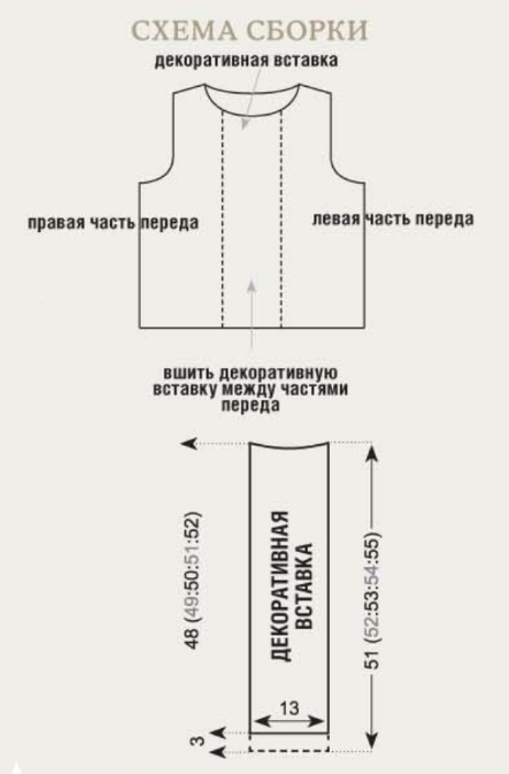 Выполнить плечевые швы. Вшить декоративную вставку между двумя частями переда (см. выкройку).