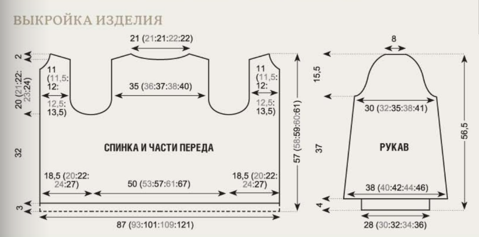 Через 32 см от начального ряда вязать первые 39 (43:47:51:58) п. (отложить для правой части переда), закрыть следующие 10 (10:10:12:12) п., вязать 110 (118:126:134:148) п. (отложить эти петли для спинки), закрыть следующие 10 (10:10:12:12) п. и вязать для левой части переда оставшиеся 39 (43:47:51:58) п.
