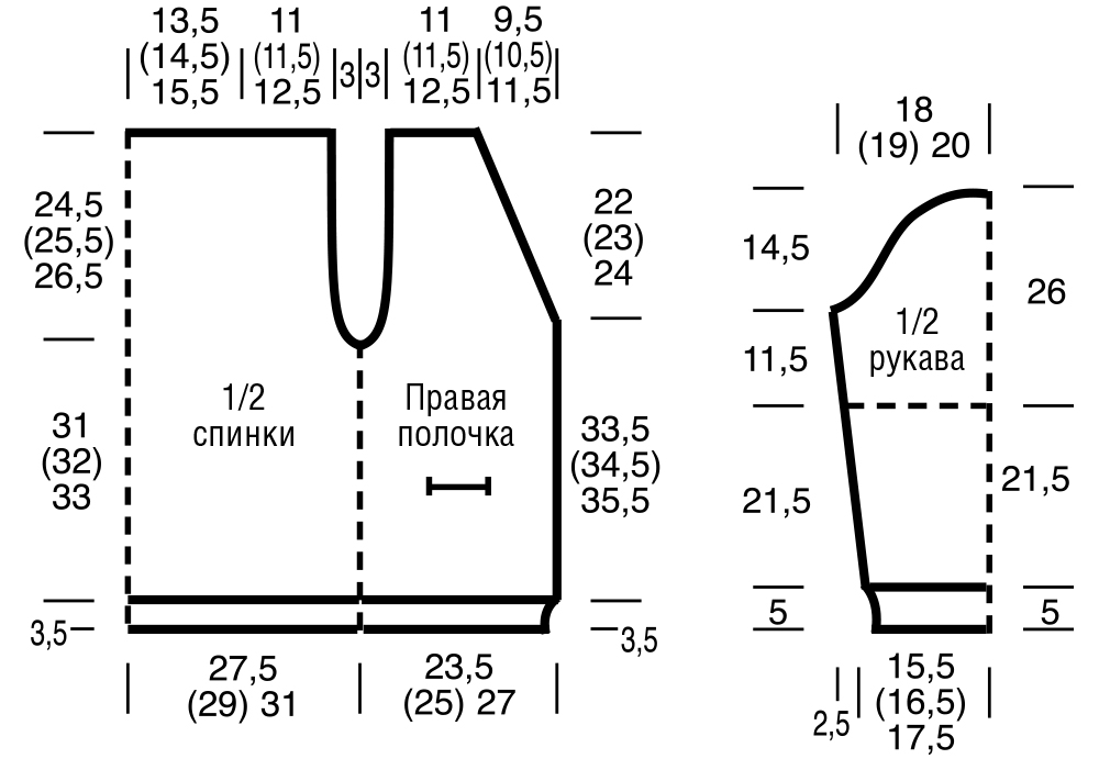 Одновременно для проймы по левому краю работы подчеркнуто убавить в каждом 8-м ряду 3 x 2 п. = 47 (51) 55 п.