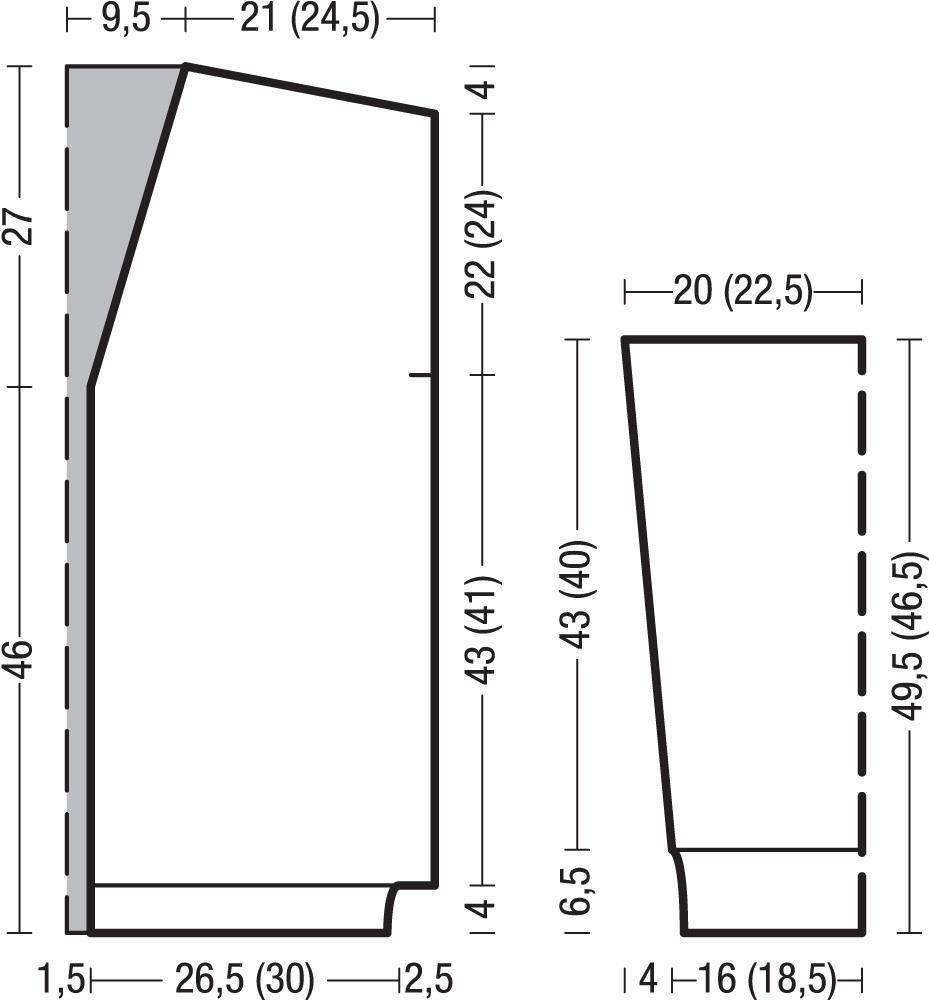 Вязать симметрично левой полочке, при этом петли для жаккардового узора В распределить следующим образом: кром., начать с 4 (5) п. перед стрелкой с, 9 (10) раз повторить раппорт из 4 п. между стрелками с и d, закончить 2 п. после стрелки d, кром.