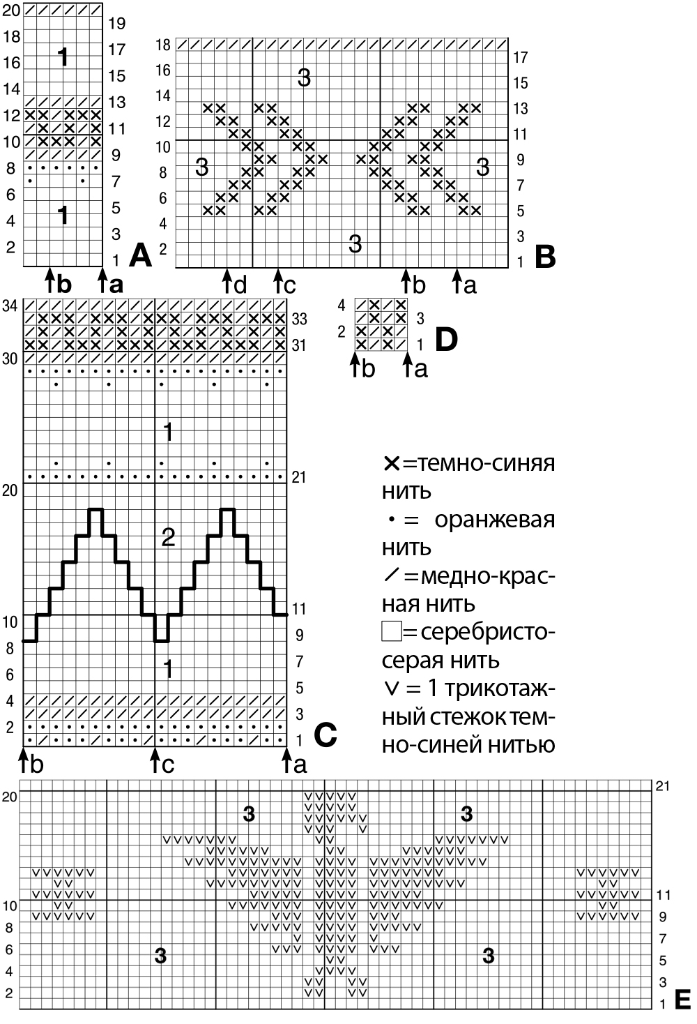Далее провязать 4 р. темно-синей нитью, 1 р. медно-красной нитью, 21 р. серебристо-серой нитью, 1 р. медно-красной нитью, 7 р. темно-синей нитью, 4 р. жаккардовым узором D, при этом петли распределить следующим образом: кром., повторять раппорт из 4 п. между стрелками а и b, закончить 2 (0) п. после стрелки а, кром.
