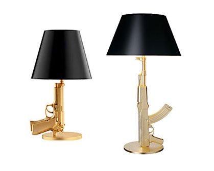 Об оружии. Зачем я сделал коллекцию ламп в виде оружия? Мы все счастливо живем, сыто едим, одеваемся, у нас хорошие машины и прочее. Но узнаем по телевизору, что каждый день тысячи людей умирают от оружия. Люди, производящие и продающие оружие, – это мы сами. Это наше правительство, которое мы выбрали. Правительство начинает войны, чтобы производить оружие, чтобы принести деньги в казну, и это хорошо. Поэтому когда мы видим на экранах телевизоров, как умирают люди, мы говорим: почему бы и нет? Это приносит деньги моей стране, я счастлив, а мои дети здоровы. Поэтому мне захотелось просто напомнить: оружие убивает одних, но приносит деньги другим. Спасибо вам, люди, которые умирают. Я использовал «Беретту» для Европы, автомат Калашникова – для России и М16 – для США. Оружие покрыто золотом, что символизирует непрерывную связь между войной и деньгами, черный абажур олицетворяет смерть, а маленькие кресты внутри него напоминают, что смерть – это не абстракция, она может коснуться и вас, и ваших детей. Я согласен – это очень страшно.