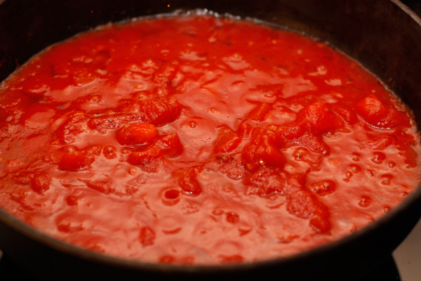 Хорошо измельчите помидоры и добавьте в сковороду к чесноку и перцу, доведите до кипения и дайте покипеть минут 5 на небольшом огне.