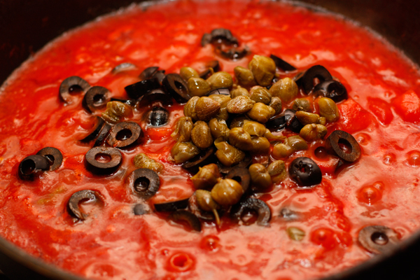 Добавьте каперсы и нарезанные маслины, посолите и готовьте еще 5 минут.