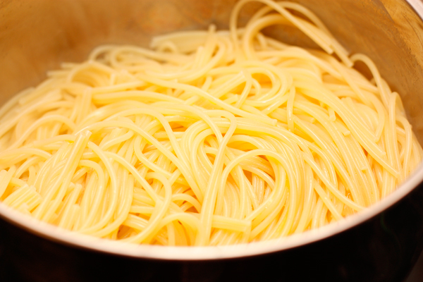 Спагетти сварите до состояния аль денте, слейте воду и сбрызните оливковым маслом.