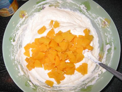 Желатин (быстрорастворимый) растворить в горячем соке хорошо помешивая. Йогурт (чудо молочный или сливочный персик-маракуйя в стаканчиках) смешать с сахаром, когда сок с желатином остынет, помешивая, тонкой струйкой ввести его в йогурт, поставить смесь не на долго в холодильник. Персики откинуть на сито, чтобы стекла лишняя жидкость, затем порезать их мелкими кубиками. Сливки взбить в пену. Затем отдельно взбить белок с каплей лимонного сока до пышной устойчивой пены. Как только йогурт начнет застывать, достать его из холодильника и хорошо размешать, если вдруг получится что он стал комками — то можно взбить его миксером. Сначала часто и тщательно мешая ложкой ввести в йогурт взбитые сливки, затем осторожно все время мешая взбитый белок, и в конце добавить персики.