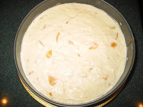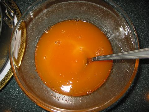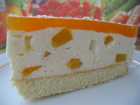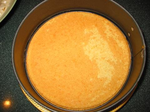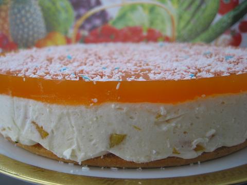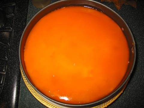 Убрать торт в холодильник минимум на 4 часа. Когда поверхность торта застынет, приготовить заливку из сока. Сок (мультивитаминный, но можно и апельсиновый) подогреть чтобы был чуть горячий, растворить в нем желатин, остудить.