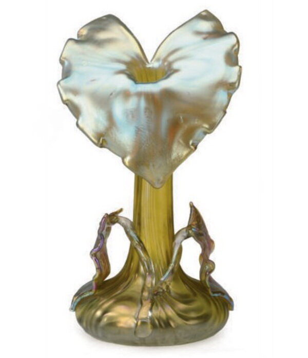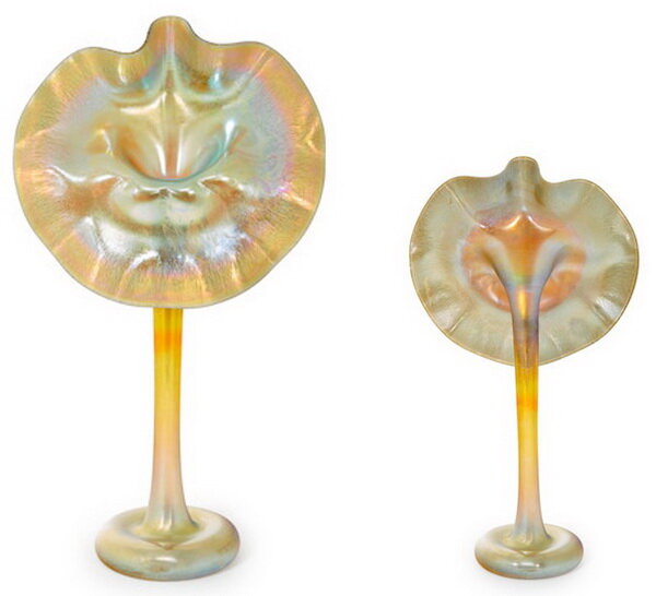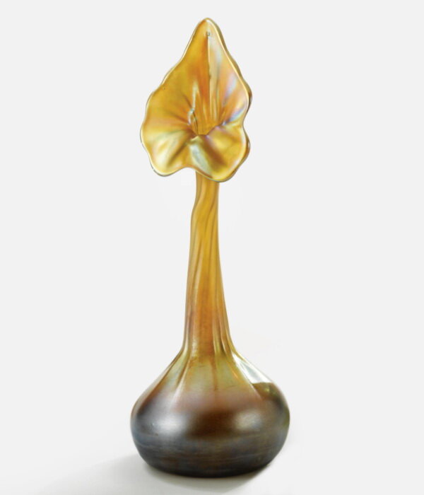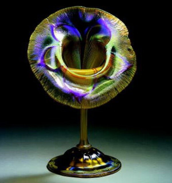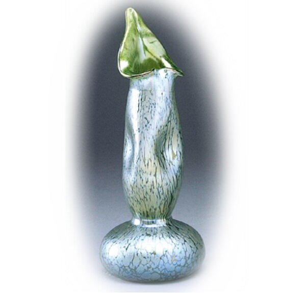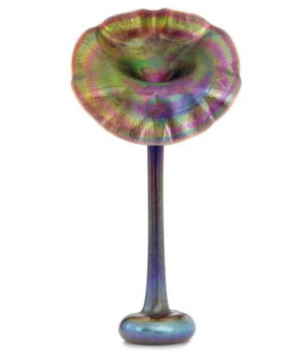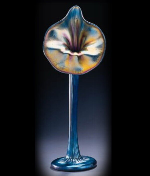Необычная форма вазы «Джек за кафедрой» наиболее выигрышным образом позволяет рассмотреть оптические эффекты на поверхности фаврильного стекла. Такие вазы были очень популярны. Их создавали из разных сортов стекла, каждое из которых по-своему реагировало с добавками, создавая собственную неповторимую переливчатость.