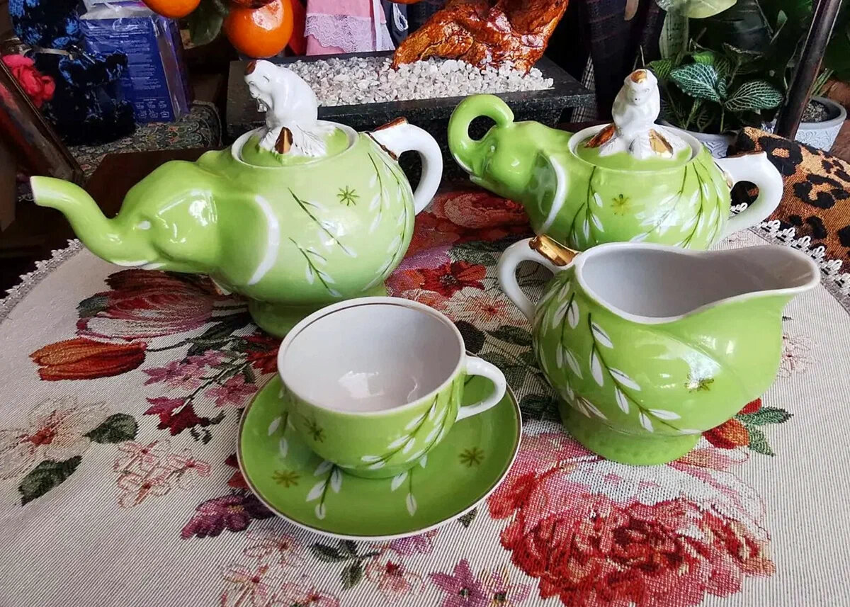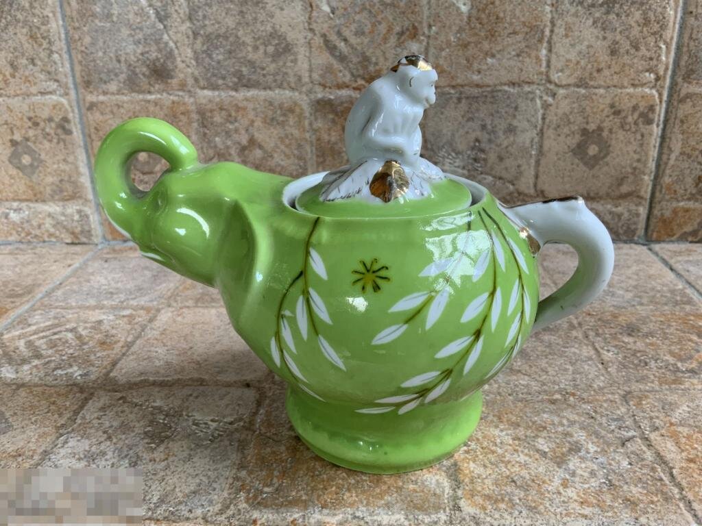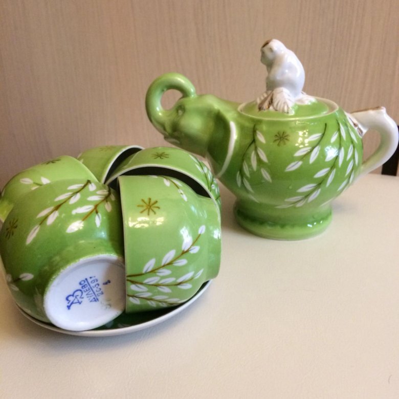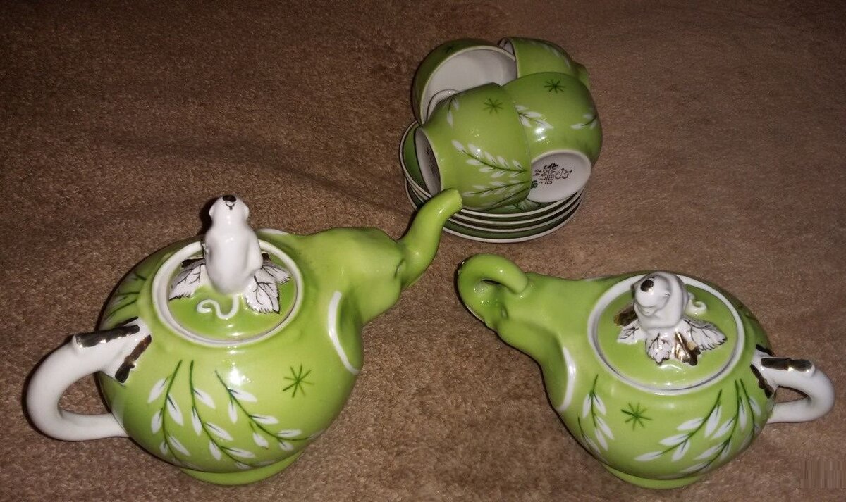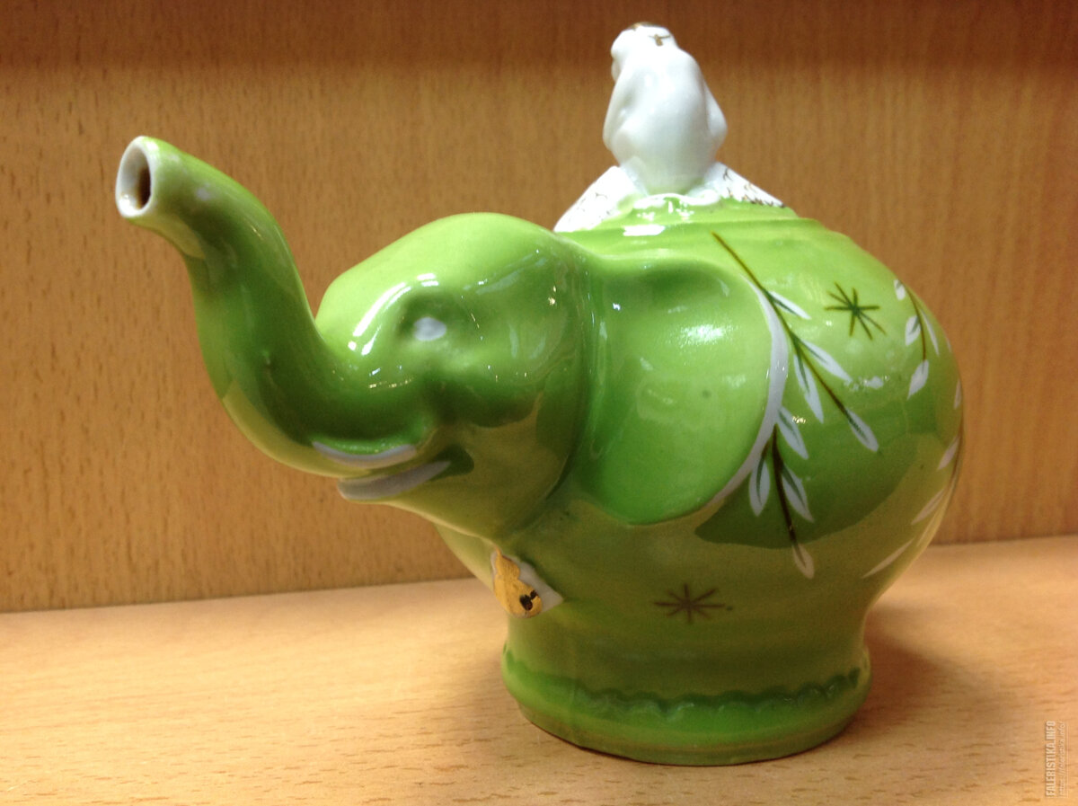 В данной галерее представлены предметы детского сервиза "Слоник" (народное название "Слоны и обезьяны") середины 1950-х годов в разных росписях. Наиболее распространённый рисунок - золотые веточки на зелёно-салатовом крытье. Но встречаются и веточки на оранжево-красном крытье, и вот такой пряничный рисунок... Здесь и далее в галерее - фото взяты из свободного доступа в интернете