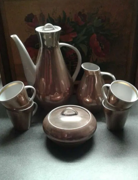 Сервиз образца 1965-го года... Форма называется "Кувшинчик". Форма приземистая, стилистика, что как раз характерно для этого скульптора, намеренно эклектична: близка к народному творчеству, но с элементами ЛАКОНИКО-ФУТУРИЗМА. В той же эстетике сделана и роспись (Художник П.В. Леонов, рисунок "Красная сетка"). Сервиз настолько редкий, что в интернете отыскался только в виде чёрно-белого фото из старой периодики.