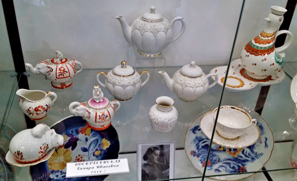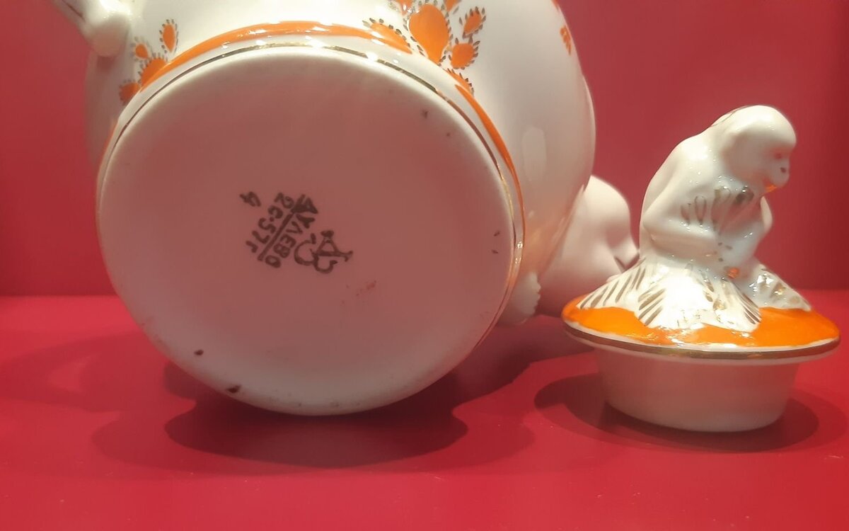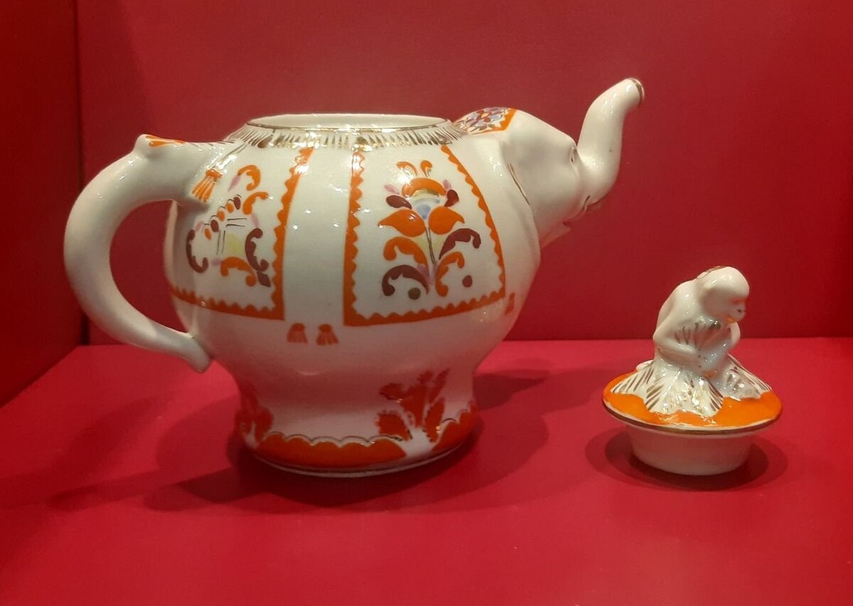 А теперь я предлагаю перейти к автору фасона - Тамаре Ивановне Воскресенской. Интересующейся фарфором публике она известна прежде всего по примечательному детскому сервизу, созданному в середине 1950-х, а прославившемуся после Фестиваля молодёжи и студентов 1957-го года. Продавцы чаще всего называют этот сервиз "Слоны и обезьяны", те историки-архивисты, что пишут в интернете статьи по фарфору, уверяют читателя, что называется фасон "Слоники". На свежем сайте от Дулёво рассказывается об ещё одном очень похожем фасоне под названием "Зоопарк". Это как бы более развёрнутый "Слоник" с бОльшим количеством предметов - там есть и маслёнка в виде гиппопотама, и сахарница в виде верблюда, и сливочник-лама. По мифологии, Тамара Ивановна изначально мечтала создать сервиз по сказке К.И. Чуковского "Айболит" - с фигурой самого Айболита и всех его друзей, но получилось два "укороченных" детских сервиза, из которых самый "укороченный" и вошёл в серию, причём некрупную.