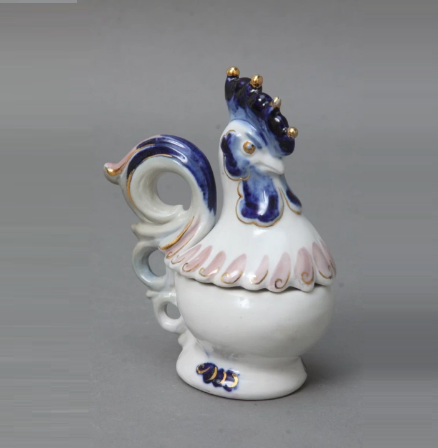 Чайник сервиза. Поднятый "воротник" и ручка колечком, расположенная выше уровня высоты тела чайника.