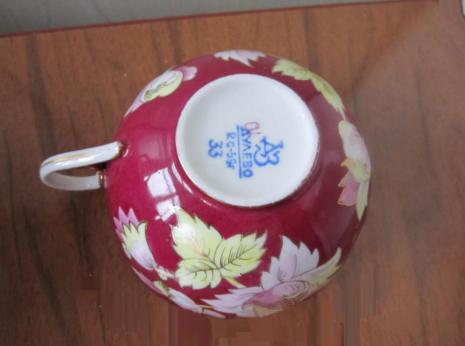 Чашка сервиза. Роспись "классическая" для Дулёво: крытьё (в данном случае - свекольного колера) и цветочный рисунок в резерве сложного абриса.