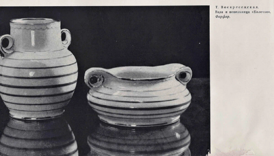Сервиз хорошо дополняют вазы с ручками-колечками. Вверху форма вазы так и называется - "Колечки" (автор формы Т.И. Воскресенская). Ваза слева по стилистике очень похожа на верхнюю. Это фактически та же ваза, но с включением дополнительных скульптурных элементов. Возможно, тоже работа Т.И. Воскресенской. Относится ли ближайшая к зрителю ваза-кувшин (справа) к работам Т.И. Воскресенской, сказать затрудняюсь.