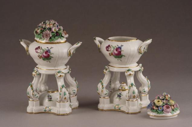 Необычно смотрелось сочетание керамики и бронзовых деталей, в XVIII столетии это считалось очень актуальным и модным. Например, в этих парных вазах попурри перфорированы бронзовые крышечки, а фарфоровые емкости покрыты эмалью со стилизацией под поверхность натуральной раковины.