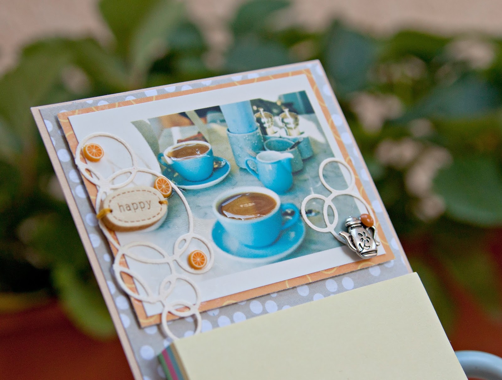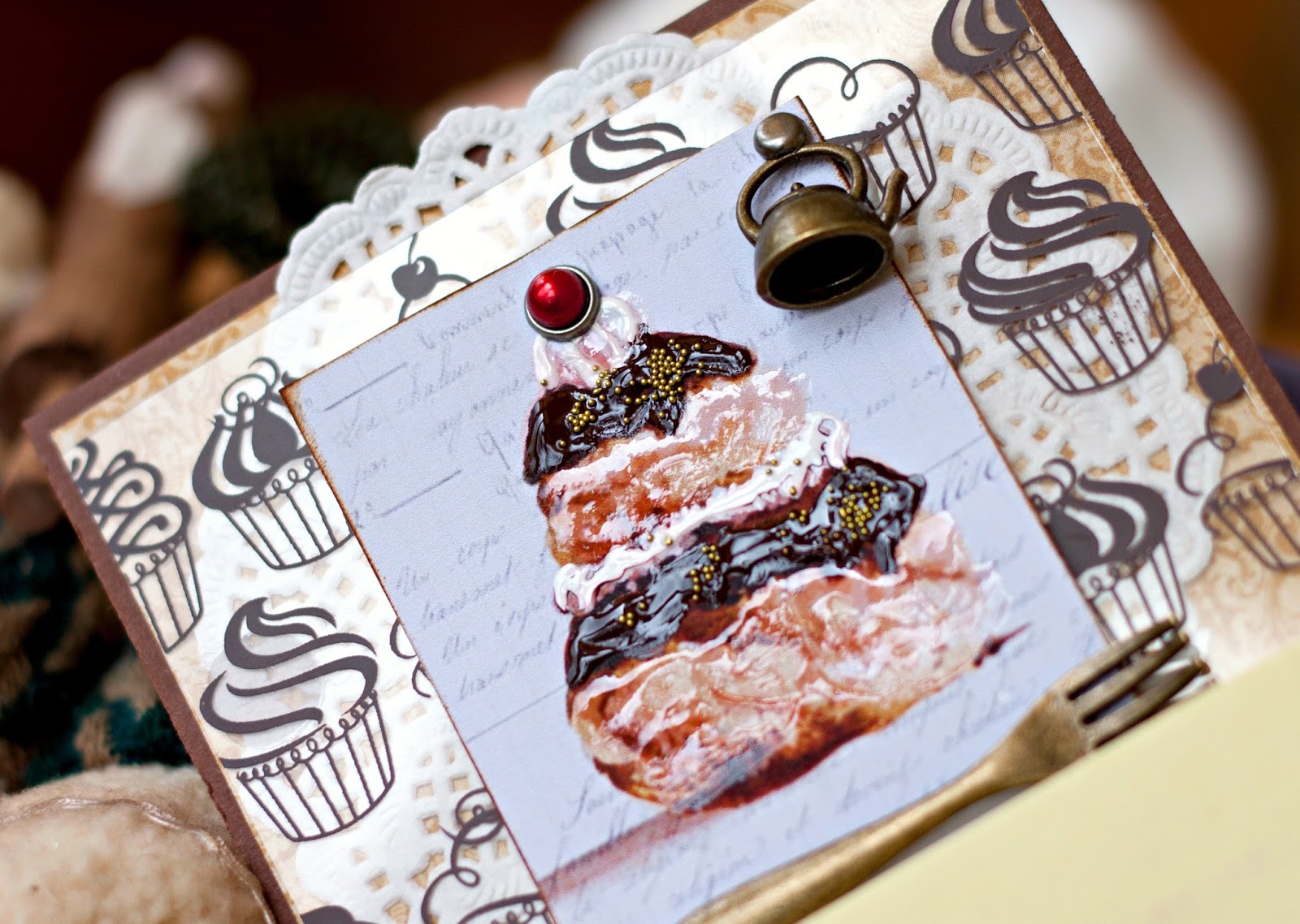 Подвеску-чайничек я вешаю на шнурочек, завязываю бант и спомощью брадса прикалываю к готовой картинке.