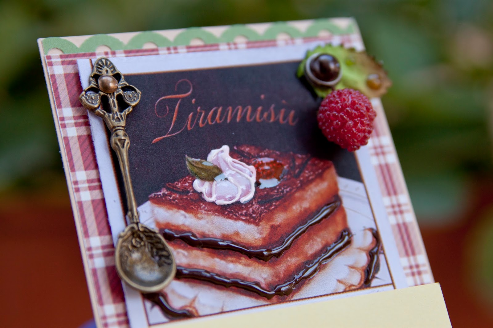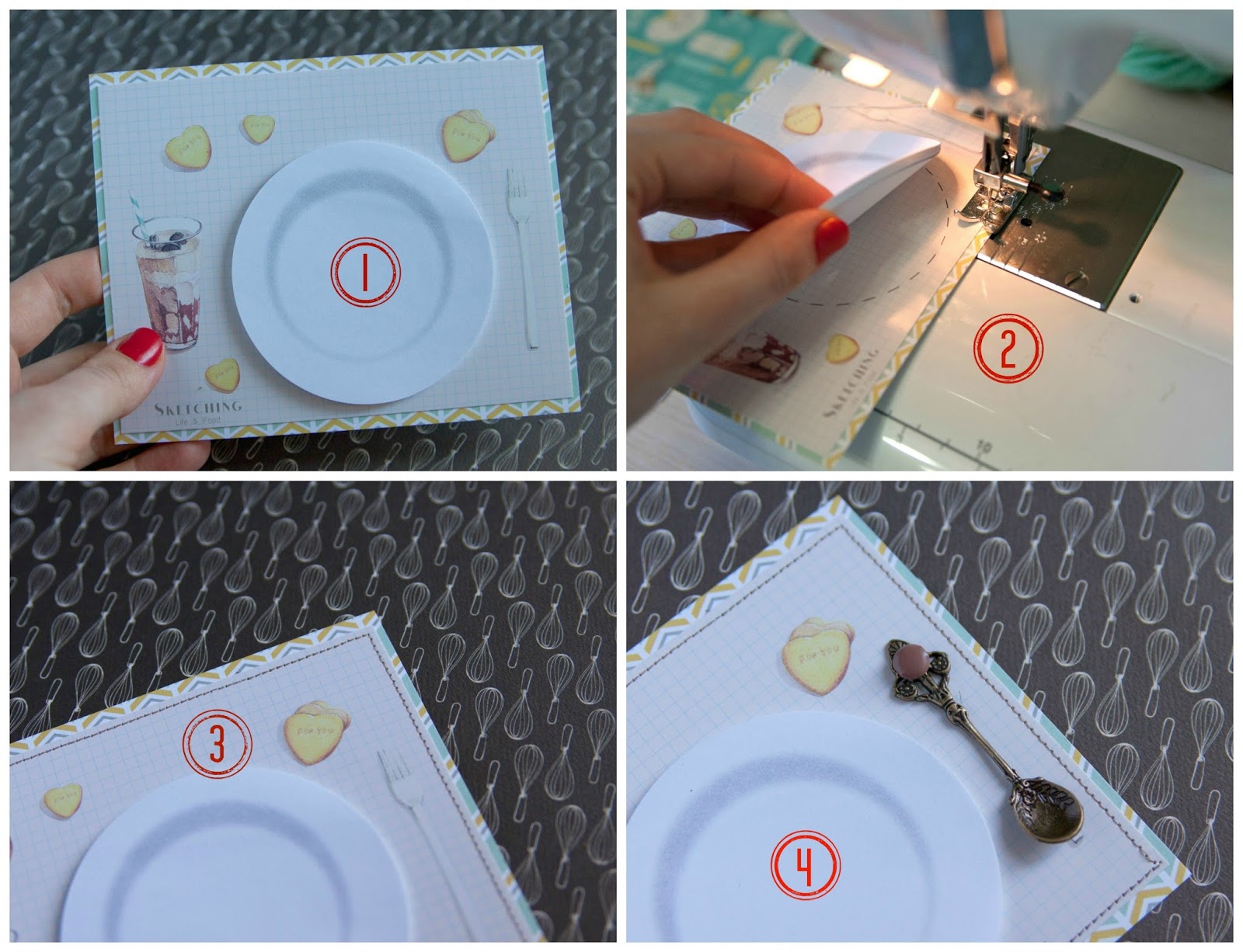 карточку сос тикерами я приклеила к скрпабумаге, прошила на машинкеи прикрепила с помощью брадс ложку.