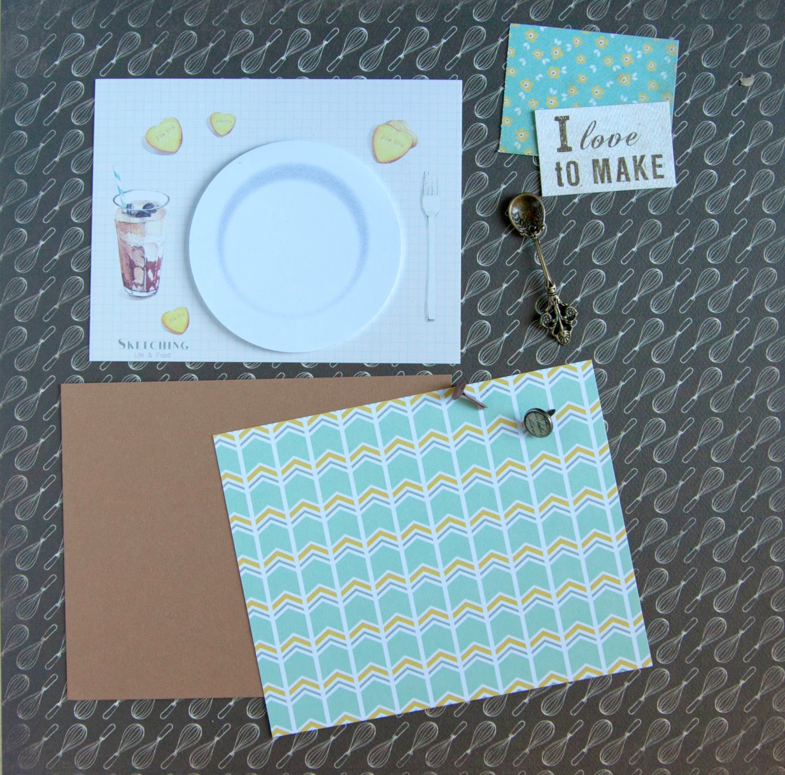 Для этого нам понадобится : сама карточка со стикерами ( я ее немного обрезала по краям), картон для основы, карточка надписью ,скрап бумага, декор - металлическая ложка и брадс.