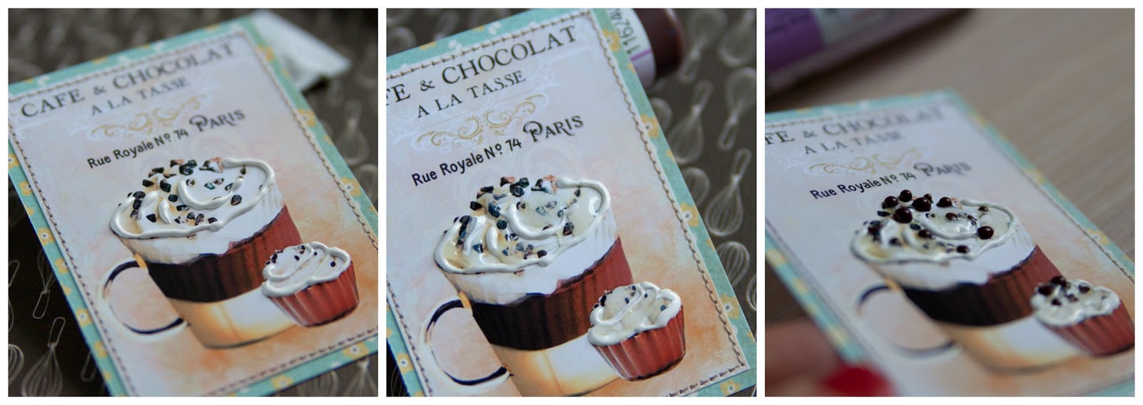 Далее буду оживлять картинку. Ранее, как только начинала делать магниты, я использовала просто картинки, а потом мне захотелось их оживить: чтоб крем был как настоящий, чтобы кофейная гладь блестела и т.д.)) Для этого я использую контурные краски ( я беру и для ткани и для стекла,подойдут любые), глосси (прозрачный клей, который при заствании оставляет глянцвый блеск), также иногда использую жидкий жемчуг, микробисер, блестки и просто бисер.