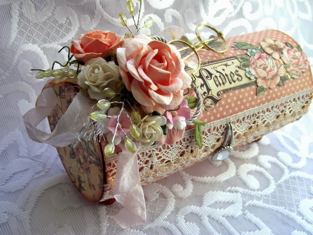 Нам понадобится: коробка от чипсов, картон, скрап бумага, 4 бусины для ножек, 1 большой брадс, резинка тонкая, краска в тон бумаги, карандаш, нож цанговый, ножницы, клей и украшения для шкатулки.