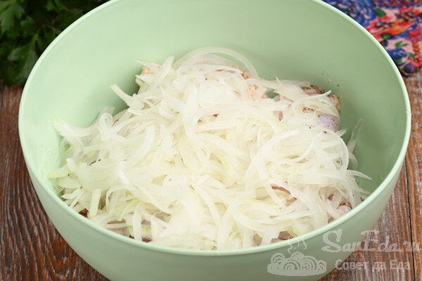 Репчатый лук (1 большая луковица) нарезаем тонкими полукольцами, жмем рукой на доске до выделения сока и отправляем к курице.