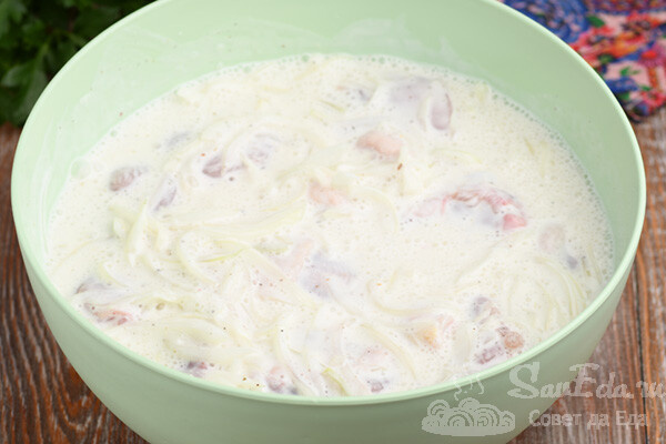 Вливаем 500 мл кефира (у меня 3,2%). Еще немного сверху солим и перчим. Хорошо перемешиваем, накрываем и отправляем в холодильник минимум на 4 часа (можно оставить на ночь).
