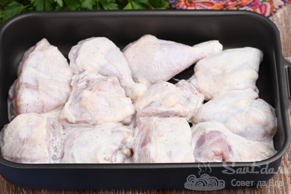 Первый вариант. Курицу весом 1,5 кг разрезаем на 11 кусков (хребет не используем). Посыпаем куски солью, молотым перцем и отправляем в миску. Можно использовать только голень, бедра или грудку.