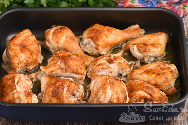 Как только бедра покроются красивой коричневой корочкой, вынимаем форму и аккуратно отрезаем верх рукава. На дне образуется много вкусного соуса с луком, поливаем им гарнир при подаче.