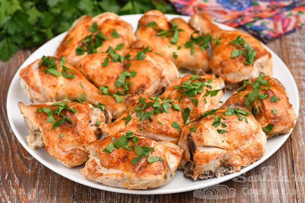 Чтобы при запекании у курицы получилась яркая аппетитная корочка, посыпаем ее сладкой молотой паприкой (1 ч. л.) и с помощью кисти распределяем по всей поверхности кусочков. Запекаем в разогретой духовке при 180 градусах 40 минут.